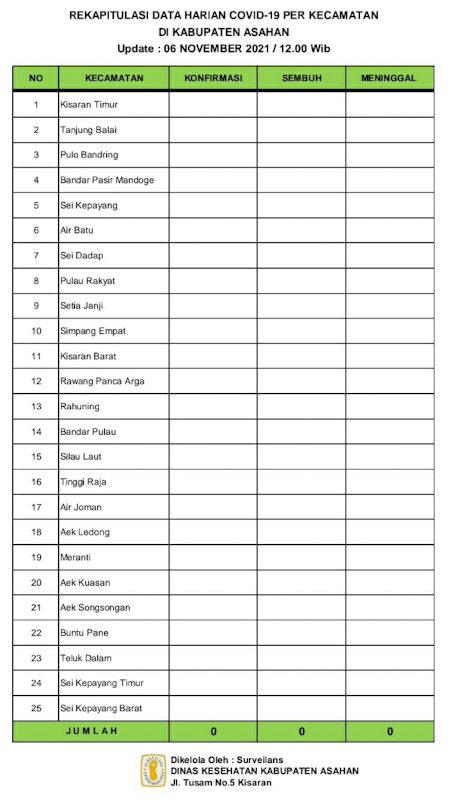 EKSISNEWS.COM, Asahan – Rekapitulasi Harian Covid – 19 per Kecamatan untuk hari ini sebagaimana data surveilans dari seluruh Puskesmas di wilayah Kabupaten Asahan yang di kelola Dinas Kesehatan Kabupaten Asahan pertanggal 06 Nopember 2021 hingga pukul 12.00 Wib, Tidak ada warga Asahan yang Terkonfirmasi Positif, Tidak ada yang sembuh dan tidak ada yang meninggal dunia.