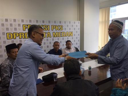 Rombongan warga diterima Ketua Fraksi Partai Keadilan Sejahtera (FPKS) DPRD Medan, Rudiyanto S.Pd.I didampingi Wakil Ketua DPRD Medan, H.Rajuddin Sagala, Sekretaris Fraksi PKS Syaiful Ramadhan dan Bendahara Fraksi Rudiawan Sitorus, S.Pil.I, M.Pem.I.