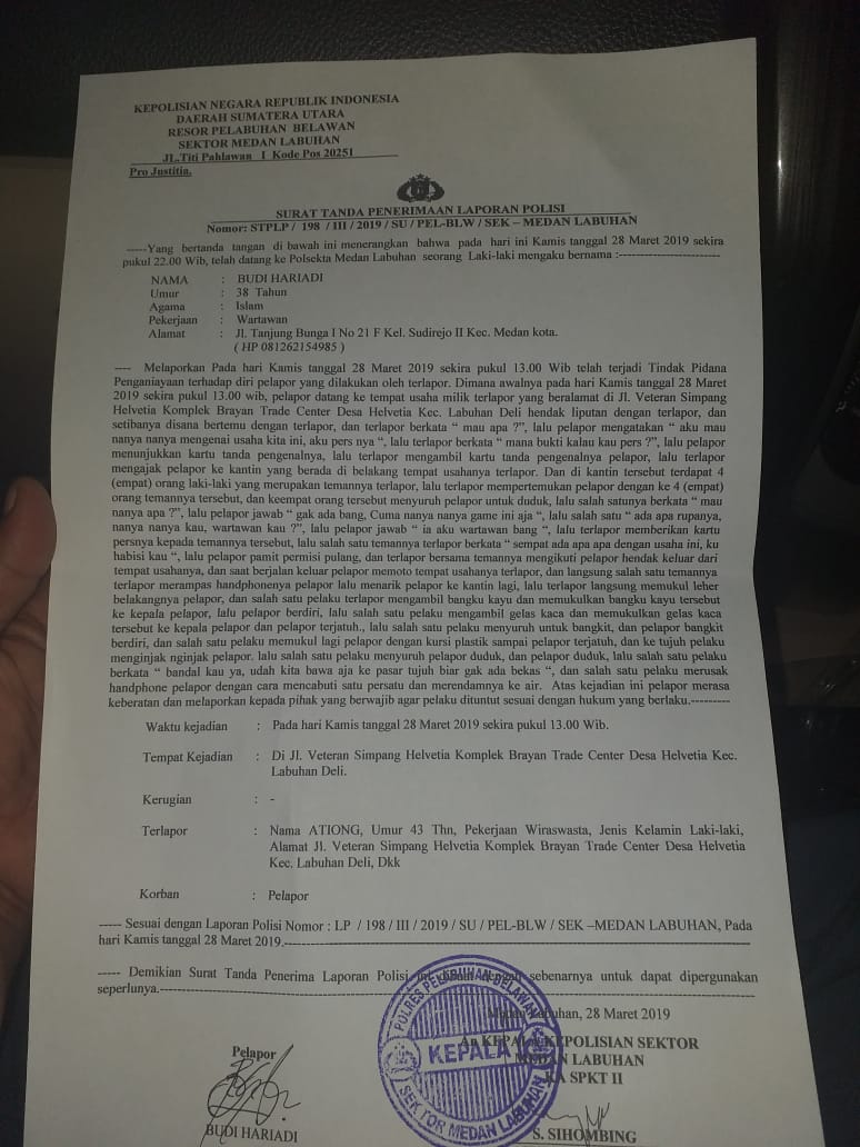 Adanya aksi tindakan kekerasan penganiayaan yang disertai ancaman yang dialami korban Budi Hariadi (38) yang sedang melaksanakan tugas dan kewajibannya sebagai seorang jurnalis yang dilakukan para pelaku tersebut, kepolisian harus meringkus para pelaku sesuai adanya laporan pengaduan korban yang telah masuk di Polsek Medan Labuhan dengan nomor LP/198/III/SU/2019/Pel-Belawan/Sek-Medan Labuhan.