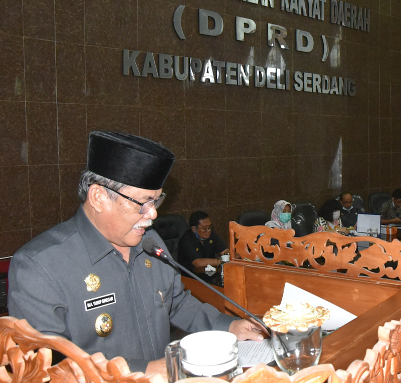 Wakil Bupati Deli Serdang HM Ali Yusuf Siregar membacakan jawaban dan keterangan Pemerintah mengatakan penyusunan R.APBD tahun anggaran 2021 merupakan bagian dari siklus pengelolaan keuangan daerah sebagaimana diatur dalam peraturan Nomor 12 tahun 2019 tentang pengelolaan keuangan daerah yang teknis penyusunannya berpedoman kepada kemendagri Nomor 64 tahun 2020 tentang pedoman penyusunan anggaran pendapatan dan belanja daerah tahun anggaran 2021 dan peraturan bupati Deli Serdang Nomor 60 tahun 2020 tentang rencana kerja pemerintah daerah kabupaten Deli Serdang tahun 2021.